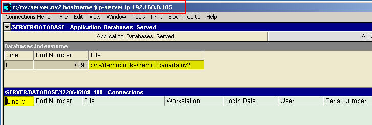 The title bar of the NewViews server window displays the server name and the server IP (Internet protocol) address as shown below. Either of these can be entered in the server field or a workstation login table row.