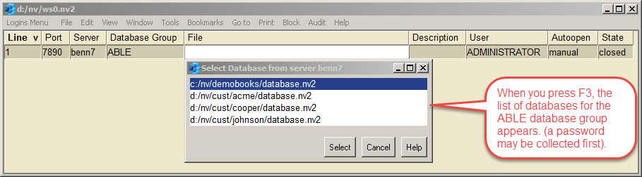 On a workstation, the user fills in the server field of a workstation login row to identify the server. When the user then positions on the file field of the login row and presses <F3>, the list of databases they are offered is exactly the set of databases in the server's database table. As mentioned earlier, for a typical company, there will be only one database in this list, but any number of databases can in fact be offered by a server.