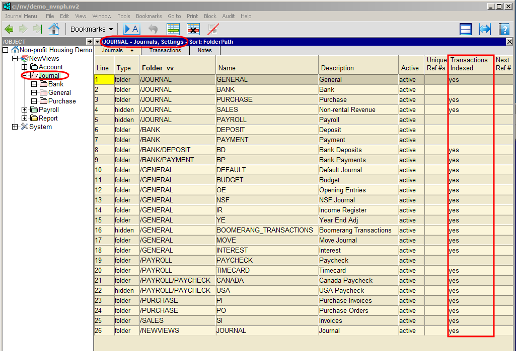 When a journal folder's transaction index is turned off, transaction detail for the journals contained in that folder are not visible. When it is turned on, all the transaction detail can be seen.