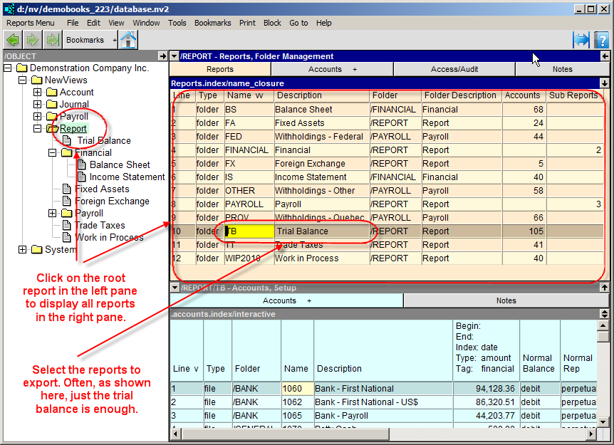 Suppose you mark only the trial balance report before exporting. The trial balance and all accounts on it are exported, but the export doesn't stop there. Remember that NewViews accounts total to other accounts. These total accounts will also be exported, even if they're on different reports. The reports that the total accounts are on will also be exported as well as any other accounts on them in turn. And if these accounts total to accounts on yet other reports, the process repeats.