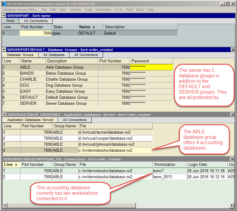 The server window above has three panes. The top pane is a table of database groups; one row for each group. The middle pane has a table of the databases for one group; specifically for the group currently selected above in the top pane. Finally, the bottom pane displays the current connections for the database currently selected above in the middle pane.