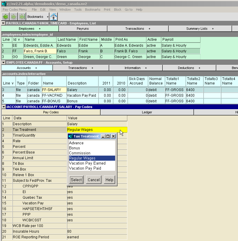 | Advance Vacation Pay Earned Vacation Pay Paid Regular Wages Bonus Commission | Advance - The account is used to manage advances to the employee. When a paycheck is processed, an amount equal to the balance of the account is deducted from the employee's check, thus reducing the advance receivable to 0.00. This deduction has no effect on tax calculations, nor do the amounts appear on a T4, Releve 1 or T4A slips. Vacation Pay Earned - This type is used to designate the earnings as vacation pay earned on the current paycheck. The earnings are not taxed, nor do the earnings appear on a T4, Releve 1 or T4A slips. Vacation Pay Paid - This type is used to designate the earnings as vacation pay paid to the employee. The earnings are subject to taxes, and do appear on T4, Releve 1, and T4A slips. Regular Wages - The earnings are to be taxed as regular taxable wages. This type is used for most salaries, hourly wages, and overtime. This type is also used when vacation pay is paid on each pay check. Bonus - The earnings are to be taxed as a bonus. Commission - The earnings are to be taxed as commissions. | ||
