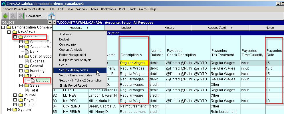 To edit a block of identical payroll accounts, navigate to the /ACCOUNTS/PAYROLL/CANADA. On the blue account table, switch to an appropriate Setup - Payroll view. See Setup - Paycodes below for more.