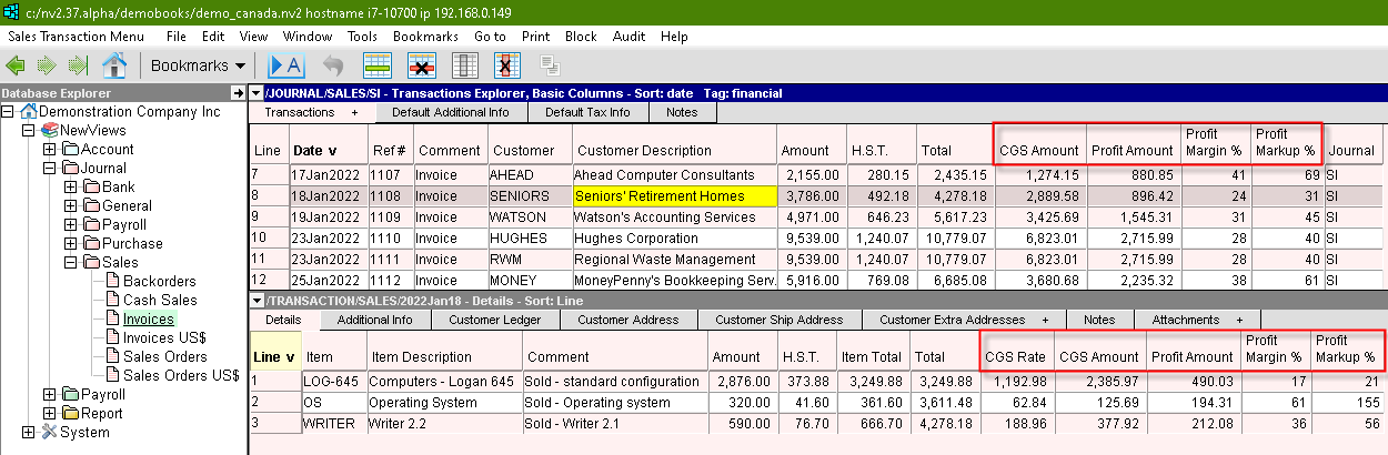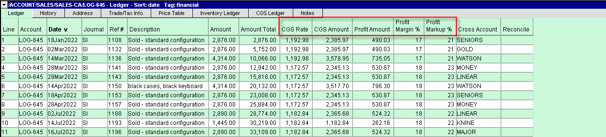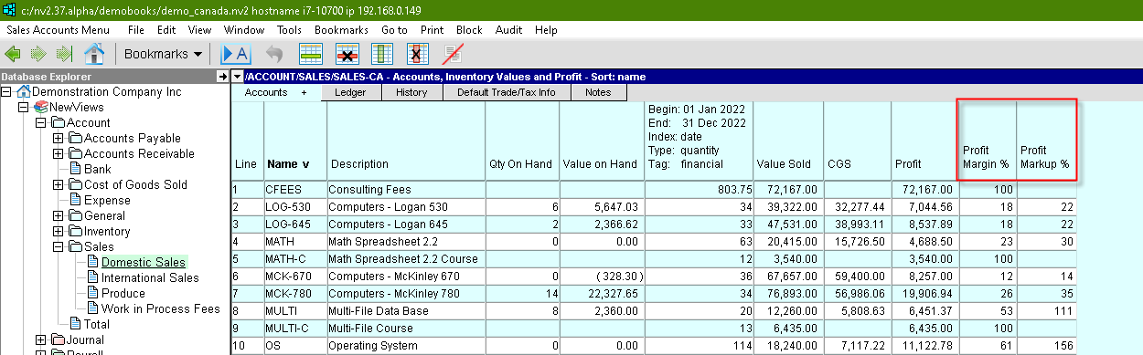 Some users have noticed that on-screen displays of profit margins and profit markups are missing, and this can lead to tedious effort with a spreadsheet. To assist with profit analysis (when sales and cost of goods sold are tracked by product or product category), several menus have been updated to allow you to place these columns where appropriate. Some examples follow: