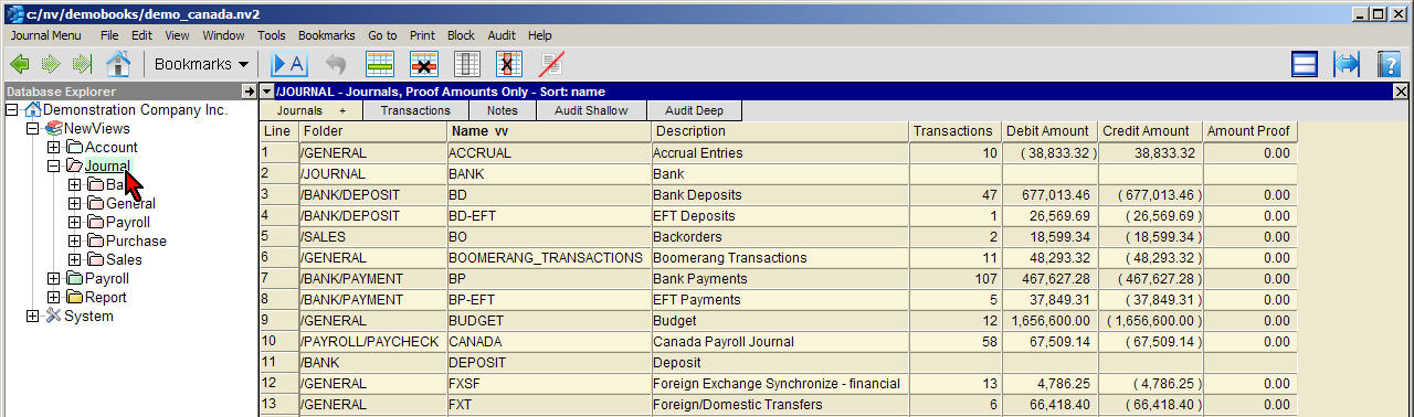 Although there is usually no need to do so, you can also activate Journal in the Database Explorer and use the Journal, Proof Amounts view to display a table of all the journals in the books. In this view, you can see at a glance that all the journals balance to 0.00.