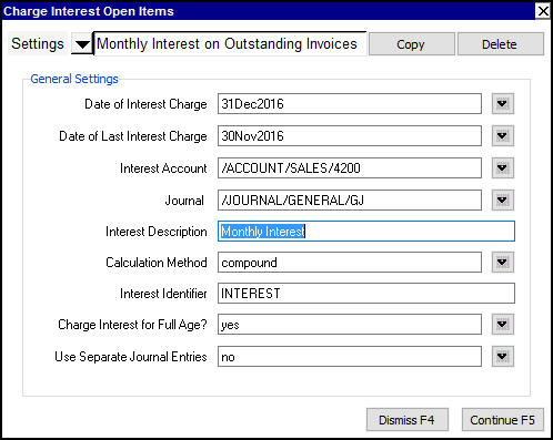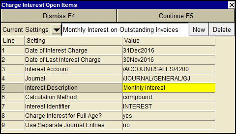 | 3 | Interest account | | The name of the account to balance the interest charge transaction (e.g. for Accounts Receivable an Interest revenue such as "Charged on Overdue Accounts"). |