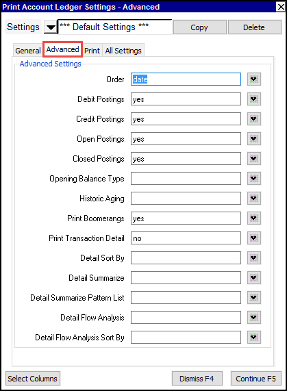 Shown below is the advanced Print Account Ledger prompt. The additional fields are used for more advanced reporting options, i.e. Historic - Aged Receivables and Flows Report.