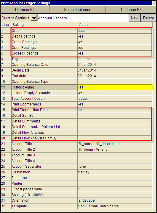 The full Print Account Ledger prompt has 28 options. The majority of ledger details can be printed with the simple prompt with 16 options.