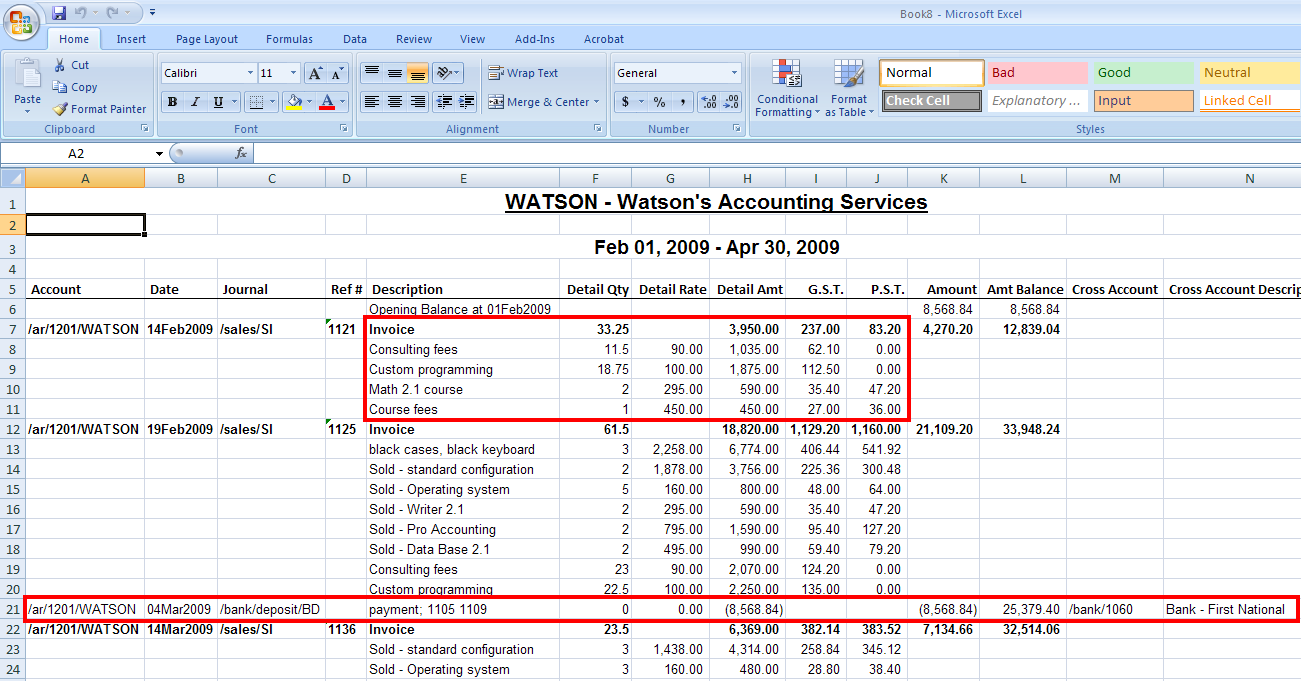 Watson is a customer. The narrow highlighted block (line 7 to 11) shows the detail columns of a sales invoice for the invoice header and the detail items. Line 21 is a "Bank Deposit" transaction showing a payment received from the customer. It is not bolded (because there are no detail items) but it does stand out with the "Date", "Journal" and "Cross Account" columns displaying values.