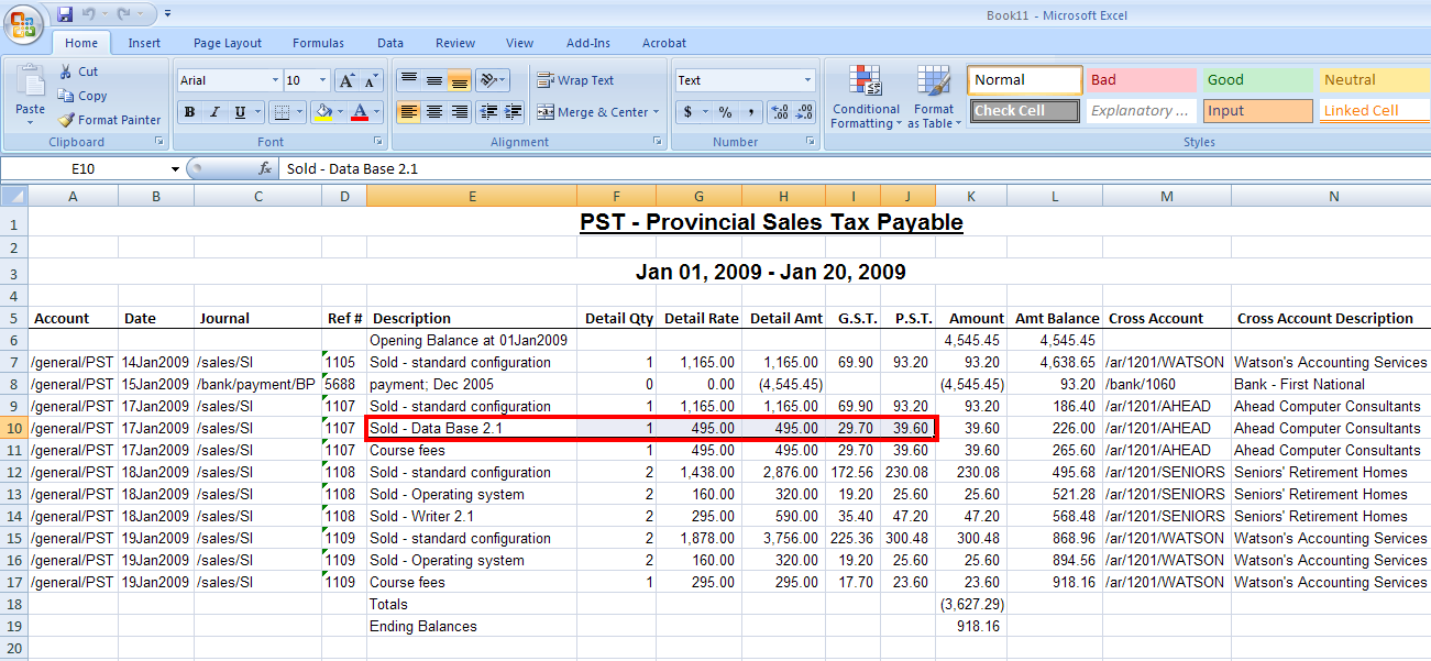 PST is a liability trade tax account. Here the detail columns display information from the sales transaction detail item.