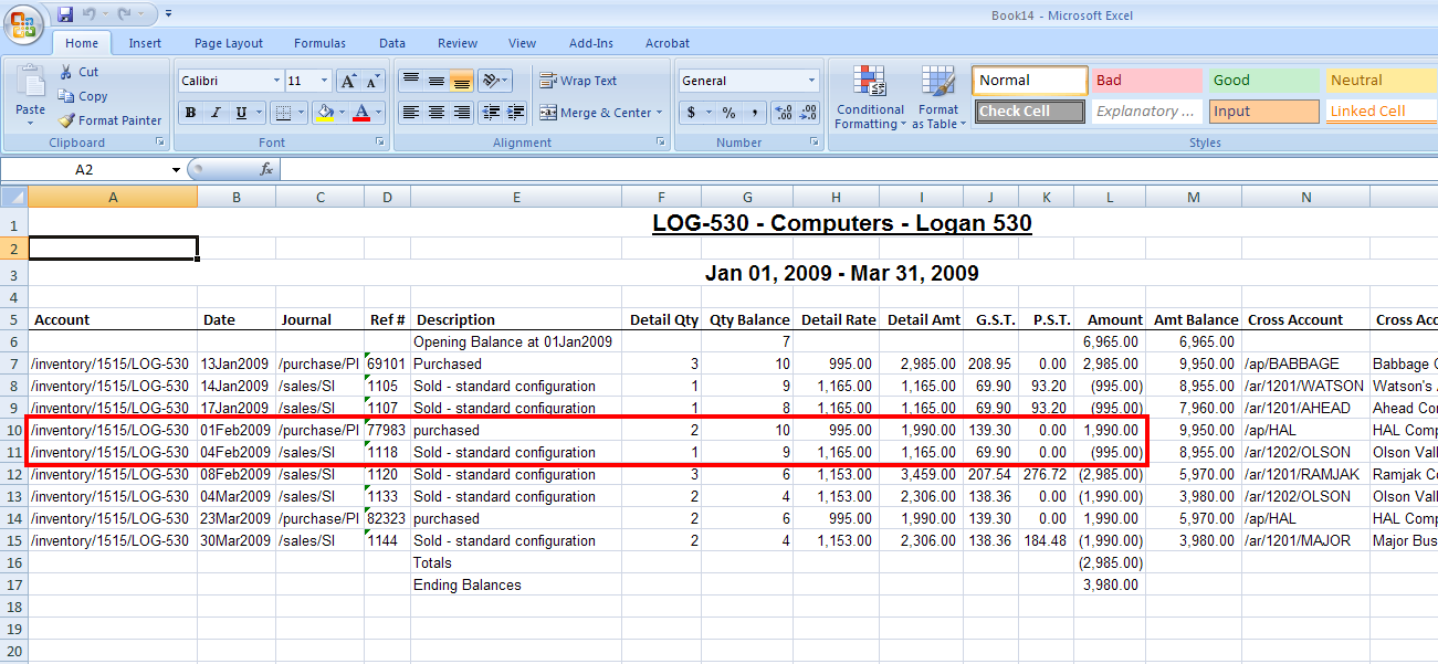 Logan 530 is a finished goods inventory account. Line 10 is from a purchase transaction detail item which (debits) increases the inventory account. Line 11 is from a sales transaction detail item which (credits) decreases the inventory account.