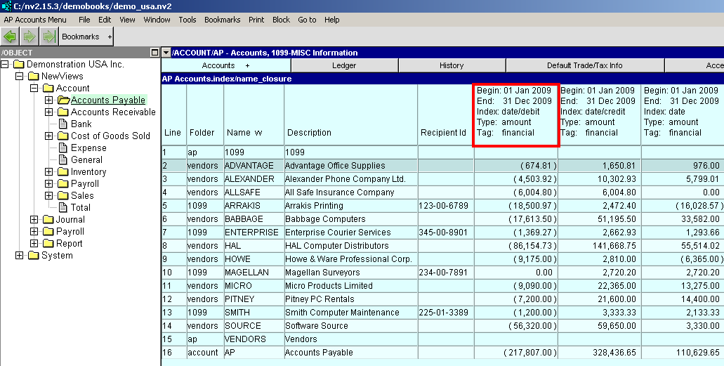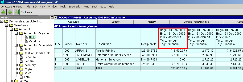 Print>1099s will take the amount to print/export from the leftmost amount column. The 1099-MISC Information view is initially configured with three columns: financial debits, financial credits, and financial balance. Payments to vendors are debits (reducing the vendor balance) and display negative. Print 1099s will use the absolute value for comparison to the "Minimum Amount", and for print/export. The financial credits and financial balance columns are just there for a visual "sanity check", and can be deleted.