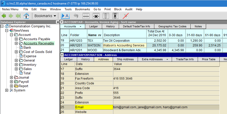 The recipient email address is found on line 25 of the AP and AR accounts address table. Multiple email addresses can be added, use a comma as the separator.