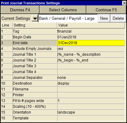 | 4 | Include Empty Journals | yes no | yes - any journal for which no transactions match the selection criteria, is simply skipped. no - prints journal (headers only) even when there are no transactions. |