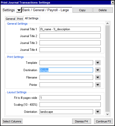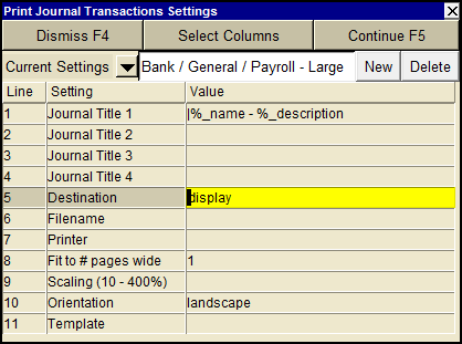 | 1 | Journal Title 1 | %_today %_path %_report_path %_name %_description %_report_name %_end %_view | Text to print at the top of each journal. Today's Date Journal's Path Report's Path Journal's Name Journal's Description Report's Name Report's Description Date Range Begin Date Range End View |