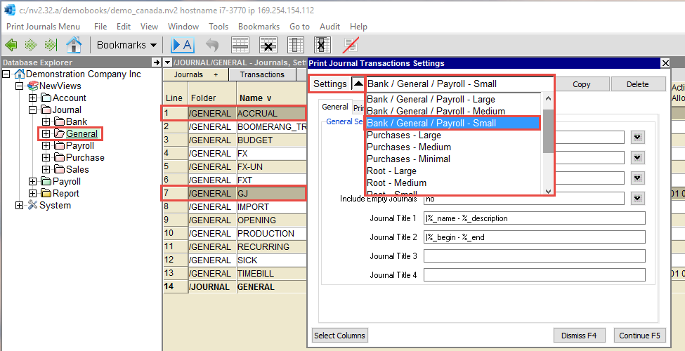 Shown below is a printout of two journals. Run from a table of journals (brown table), with the Accrual and General journals selected. The date range was set from Jan 1, 2016 to Jan 31, 2016. From the Print Journal Transactions settings prompt, we selected the Bank / General / Payroll - Small setting, as shown above.