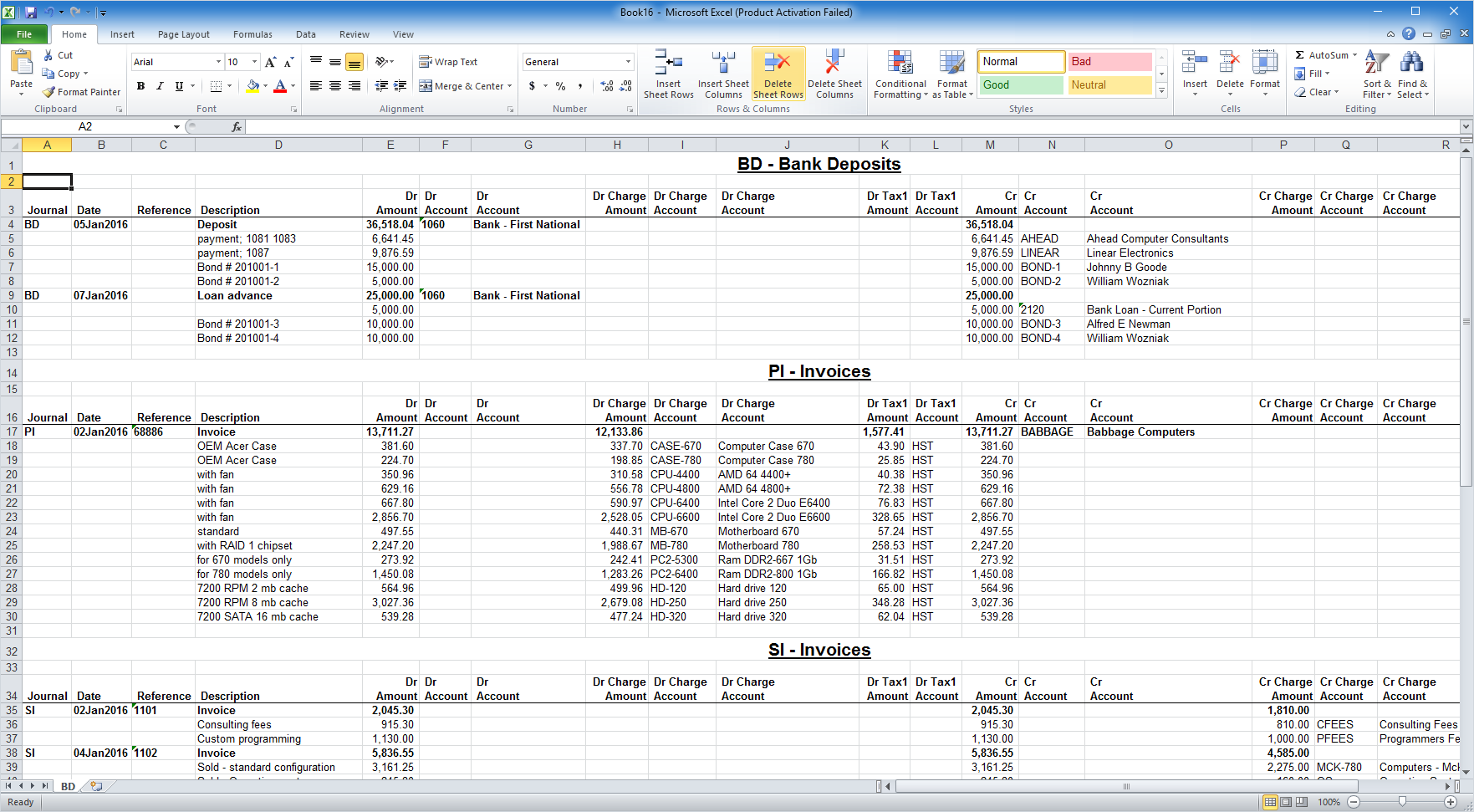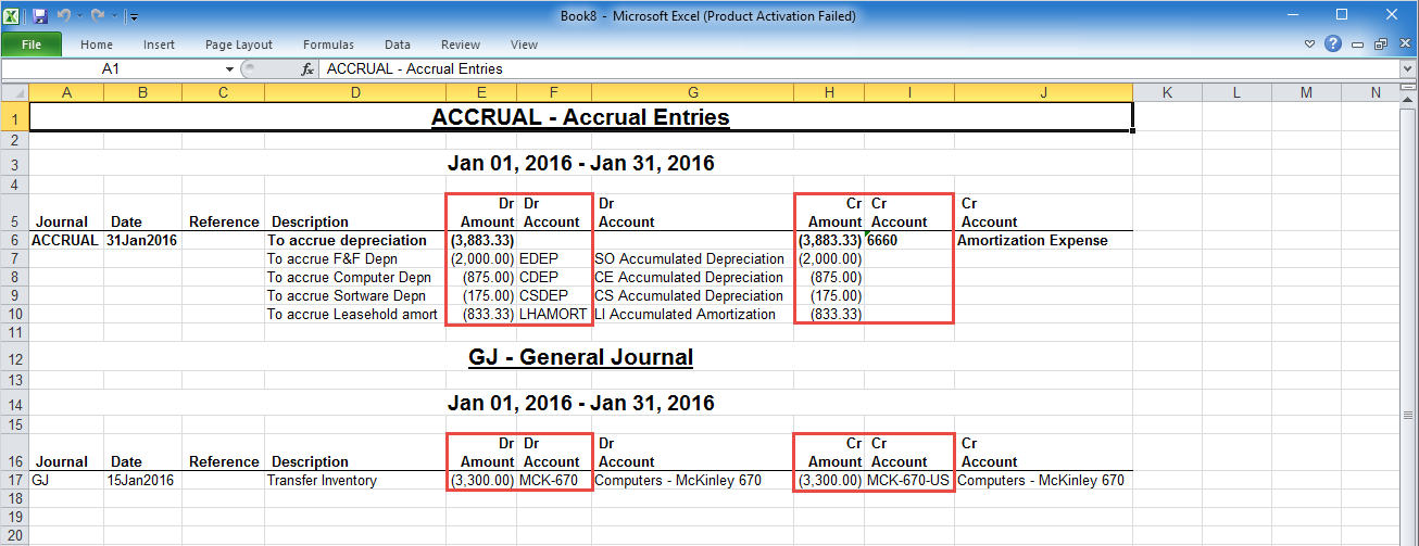 Row one below is the heading for the 1st journal, followed by one sample transaction, an accrual entry on Jan 31, 2016 on row 6. Row 12 is the heading for the 2nd journal, with a simple transaction on row 17. Both journals are displaying the Debit amounts and accounts in columns E and F with the Credit amounts and accounts in columns H and I.