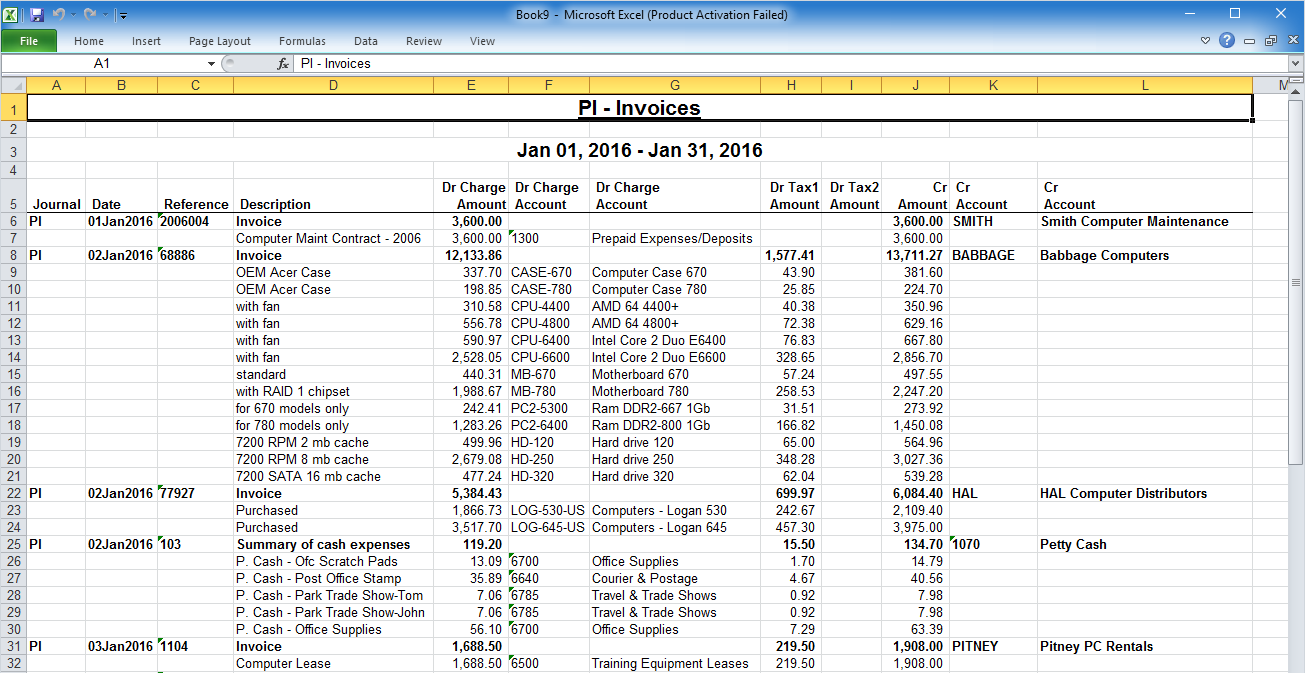 Purchase transactions typically are not just simple debit and credit postings. Show below are transactions with Debit charges posted to Inventory, Expense and Tax accounts and Credits posted to Vendor accounts. Note that no postings where debited to the TAX2 account. From the Print Journal Transactions settings prompt, we selected the Purchase - Small setting.