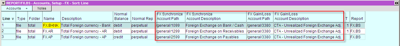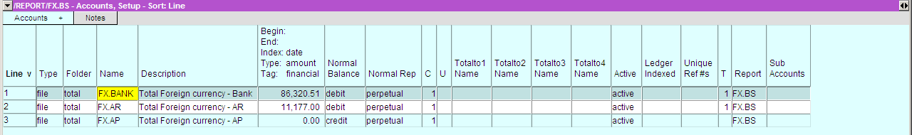 Most foreign exchange setups include 5 total accounts to gather the period foreign values to convert. Assets (Bank & AR), Liabilities (AP), Sales and Expenses.