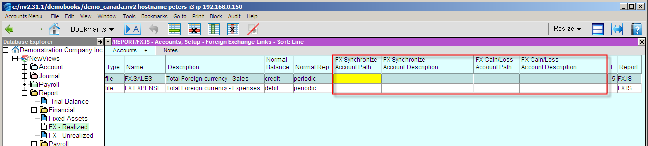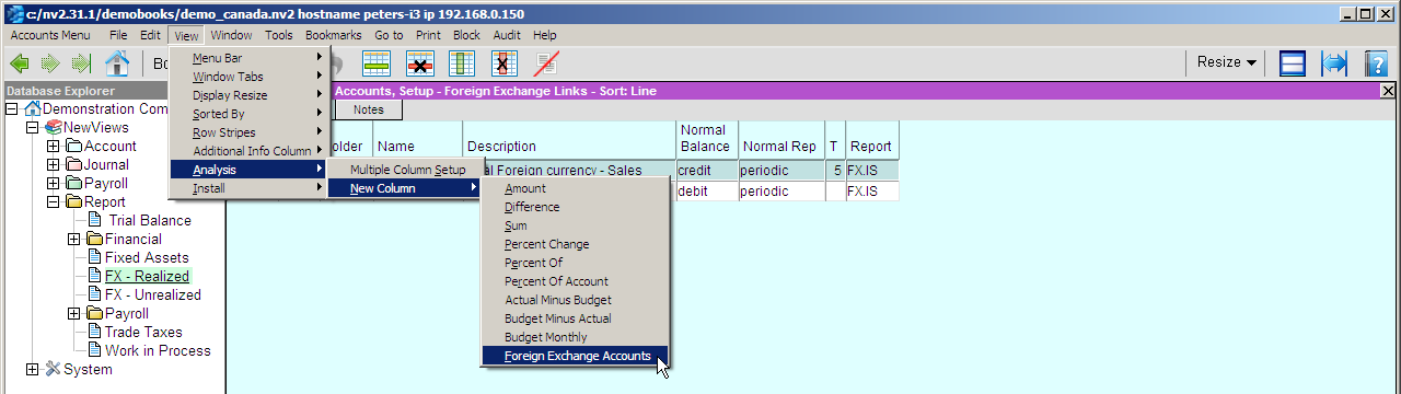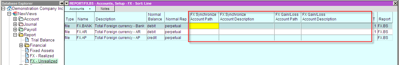 Use the View>Analysis>New_Column>Foreign_Exchange_Accounts command to add four columns to the setup view for linking the foreign exchange areas in the books.