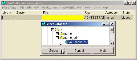 Books can also be stored in folders, in which case the path to the books is specified in the file name. When books are converted from NV1, they are assigned the name database.nv2 and stored in a folder within the NewViews directory. For example, an NV1 set of books called acme that was converted to NV2 might appear in the File field of the NewViews workstation as follows: