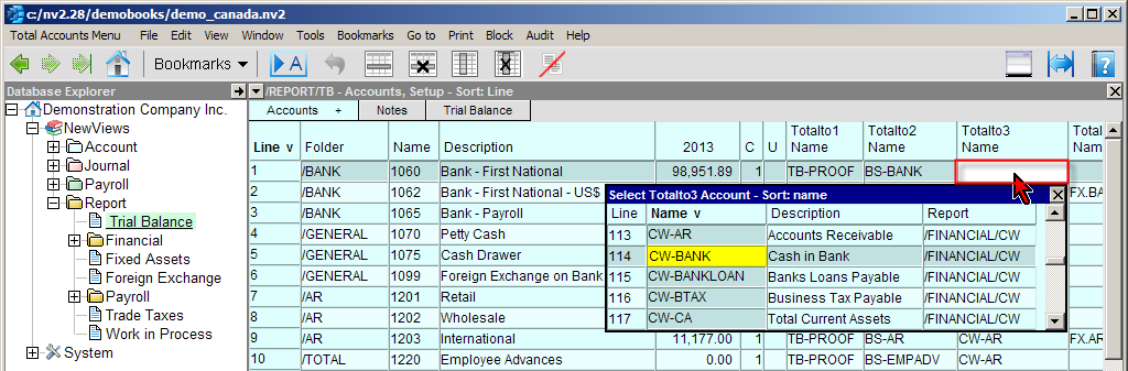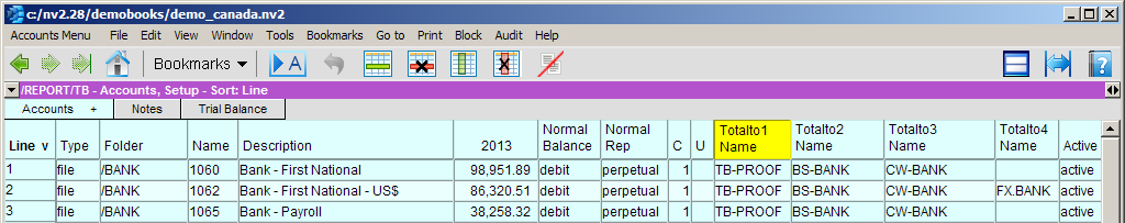 Line 1, account 1060 has two totaltos; TB-PROOF (an account on the same report, i.e. the trial balance), BS-BANK (an account on the balance sheet).
