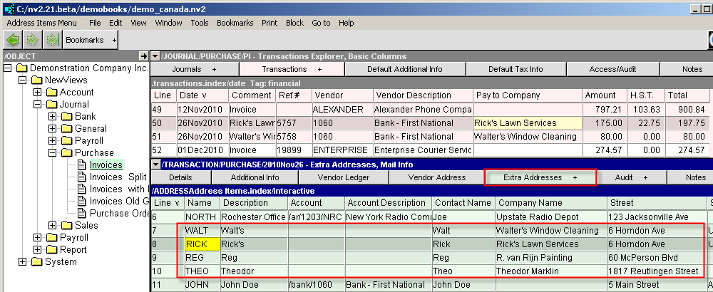 In the screen shot above, NewViews is positioned on an accounts payable journal. The screen below is showing the "Extra Addresses" table. Press <Insert> to add a new address. Fill in the appropriate information.