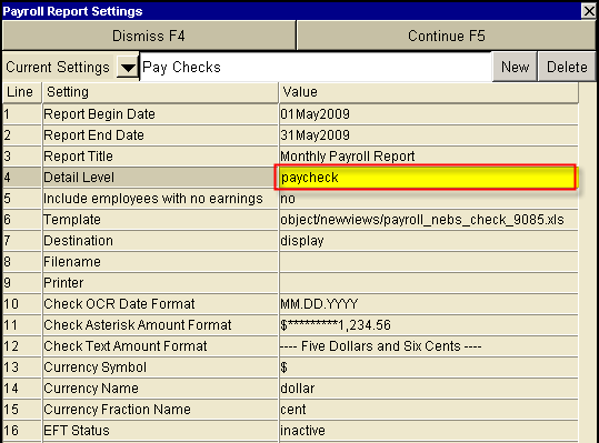 Fill in the settings and click <Continue>. Remember to specify paycheck as the Detail Level and select your new custom template as the Template.