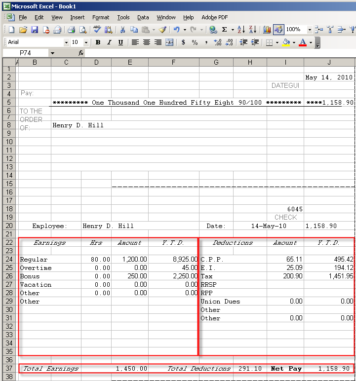 The sample check shown below was generated using the report settings above. Notice that detailed earning are printed on the left side of the stub, and detailed deductions are printed on the right side, with a total row below. The full laser check has two repeating stubs.