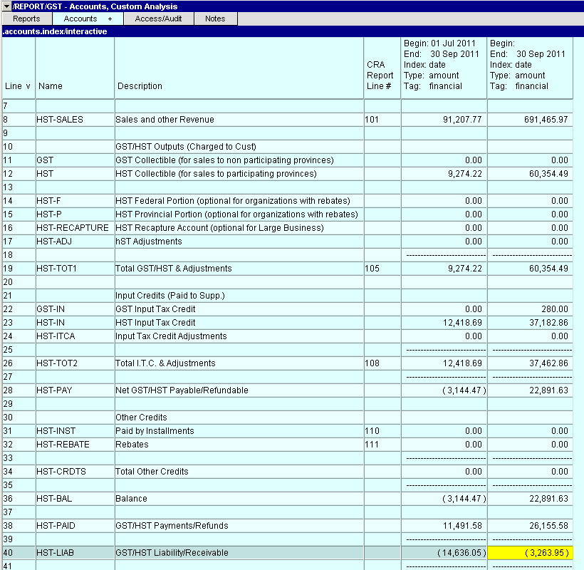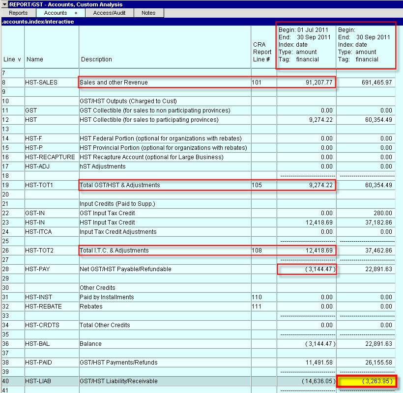 The three main numbers that need to be reported to the CRA should be extracted from column one that is set with the periodic date range. Sales (line 101) is 91,207.77, Total GST/HST (line 105) 9,274.22 and Total ITCs (line 108) 12,418.69. They will not add up to (3,263.95) however, given the variance due to back dated invoices.