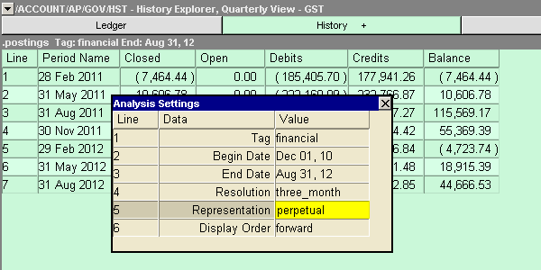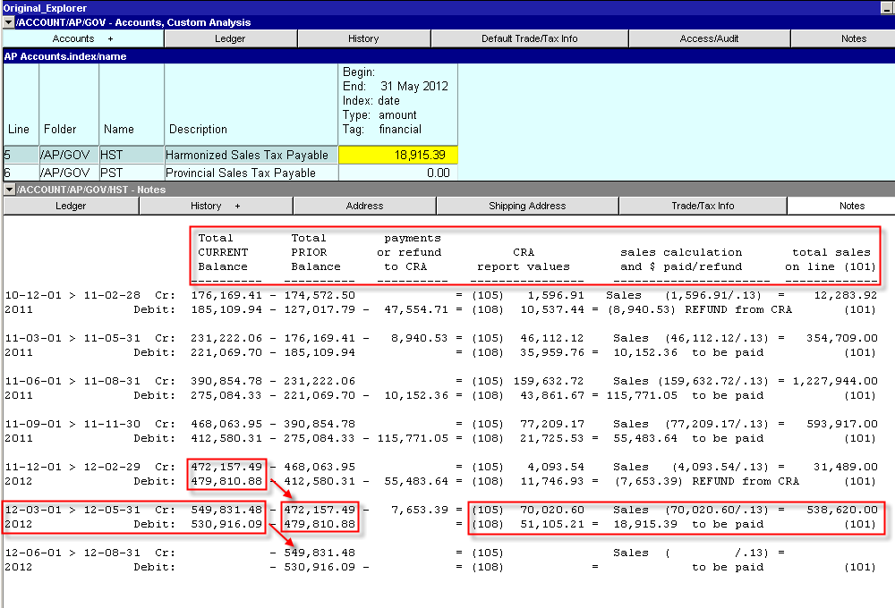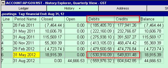 In the example above, the reporting period is from 12-03-01 to 12-05-31. The total (perpetual) credit balance of the GST/HST account (history view) is 549,831.48. The total (perpetual) debit balance of the GST/HST account (history view) is 530,916.09.
