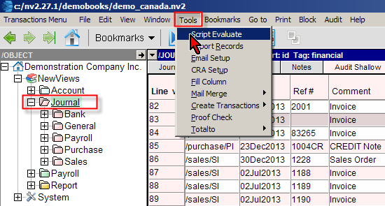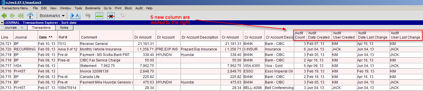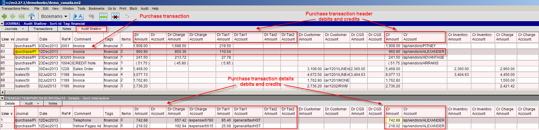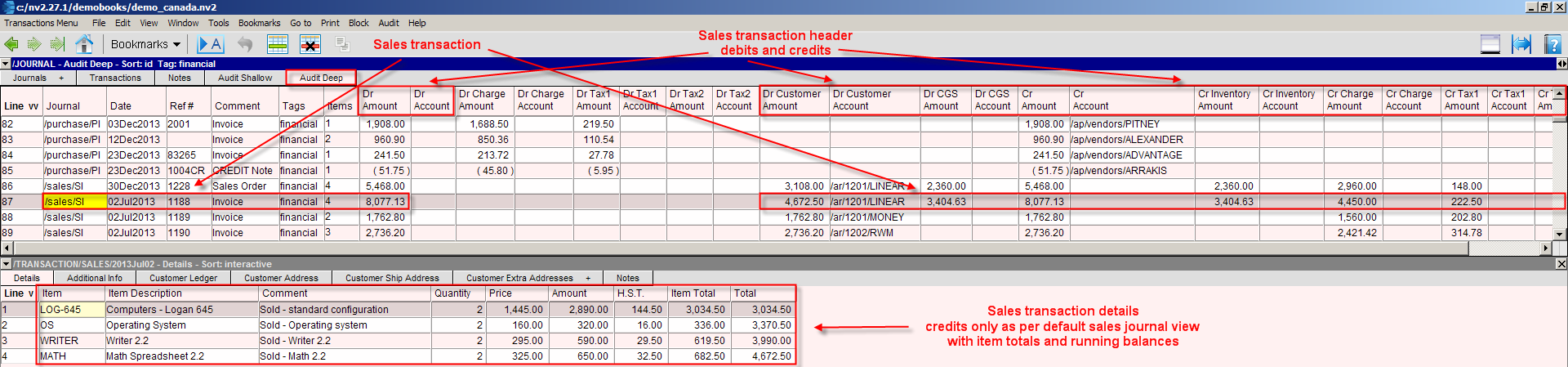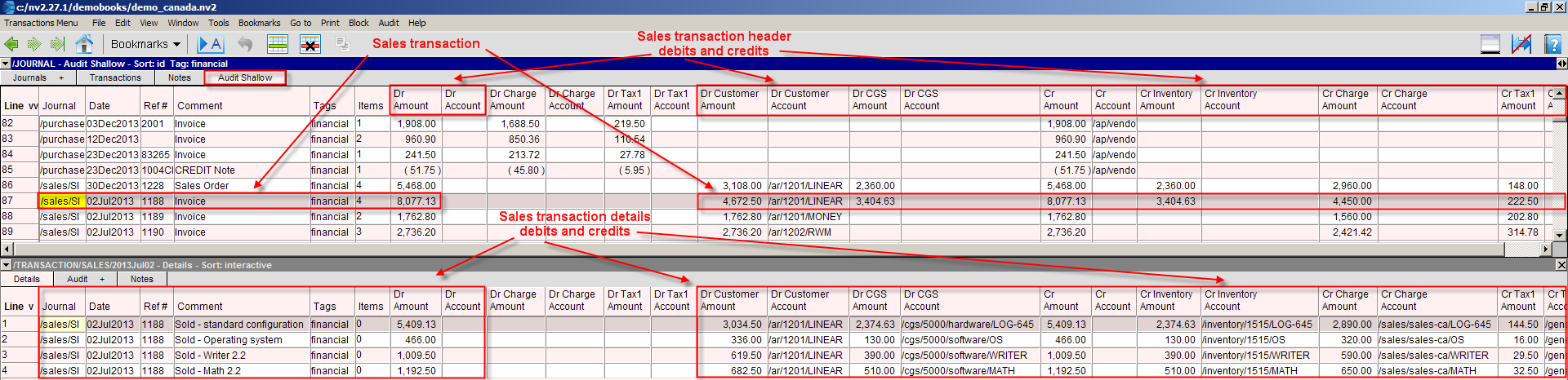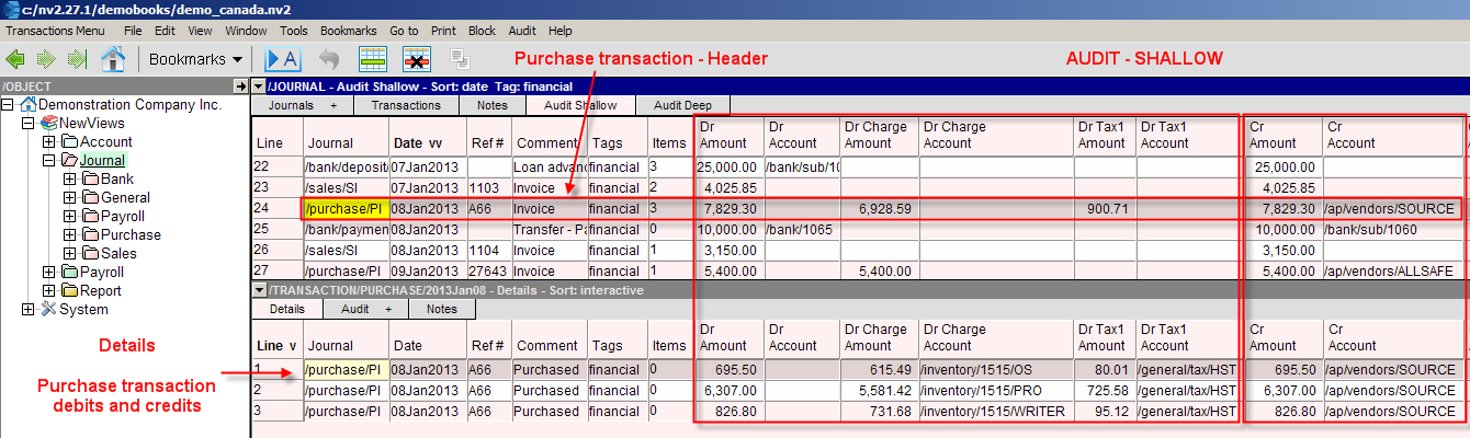 To look at a list of all transactions in the books, activate the root journal (Object/NewViews/Journal). Switch to the audit shallow tab. The journal desktop displayed in the bottom window will have consistent columns as you move from one transaction type to another as you move up and down through the transaction table in the top window.