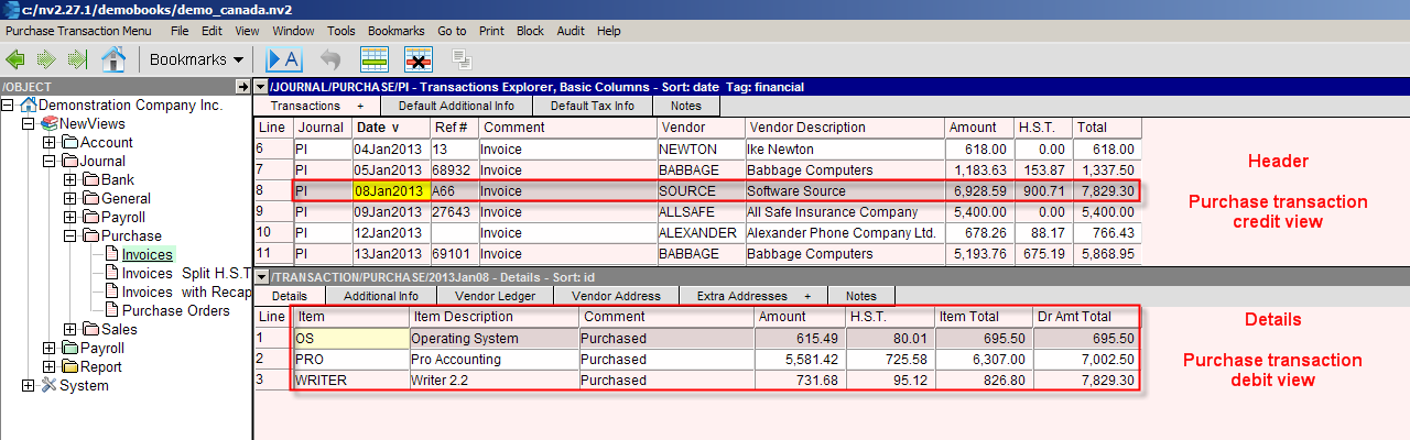 Important Tip: This view is most clearly seen when the column widths of the transaction headers (in the controlling window pane) are identical to the columns widths of the transaction detail items (in the detail window pane).