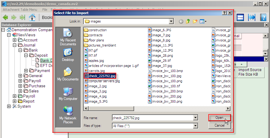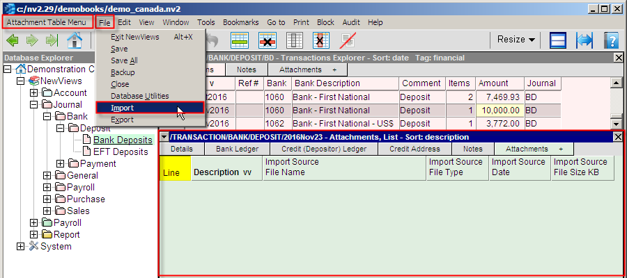 In the Database Explorer, navigate to the item for which attachments are to be imported (e.g. a bank deposit transaction).