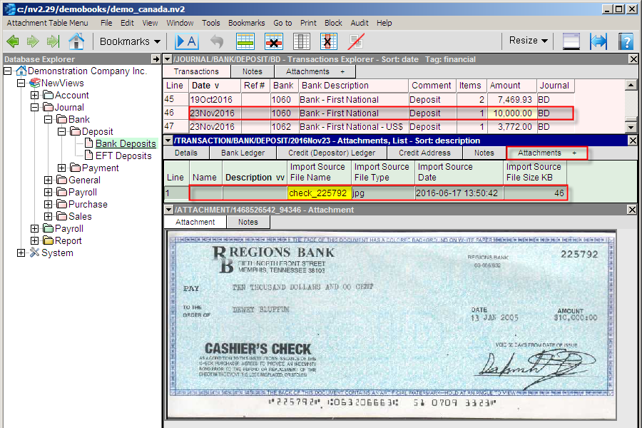 Shown below is an example of importing an attachment to a bank deposit transaction's attachments. It is a scanned image of a check for a long overdue payment. (Never mind the image details - for example the check is dated in 2005 - it's just a sample poached from the Internet)