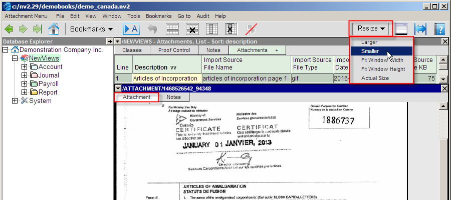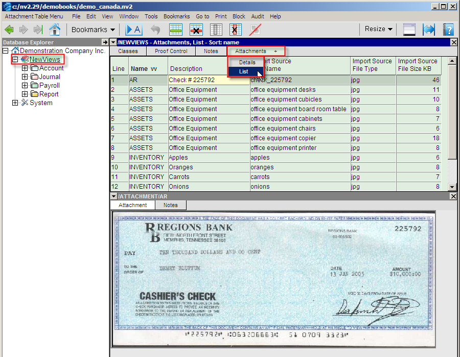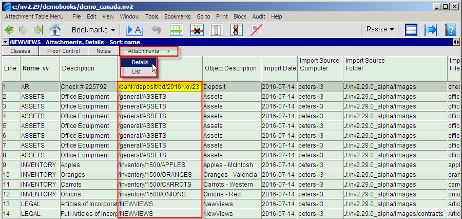 A table listing all the attachments in a set of books can be displayed by activating the NewViews folder and installing the Attachments tab in the detail window.