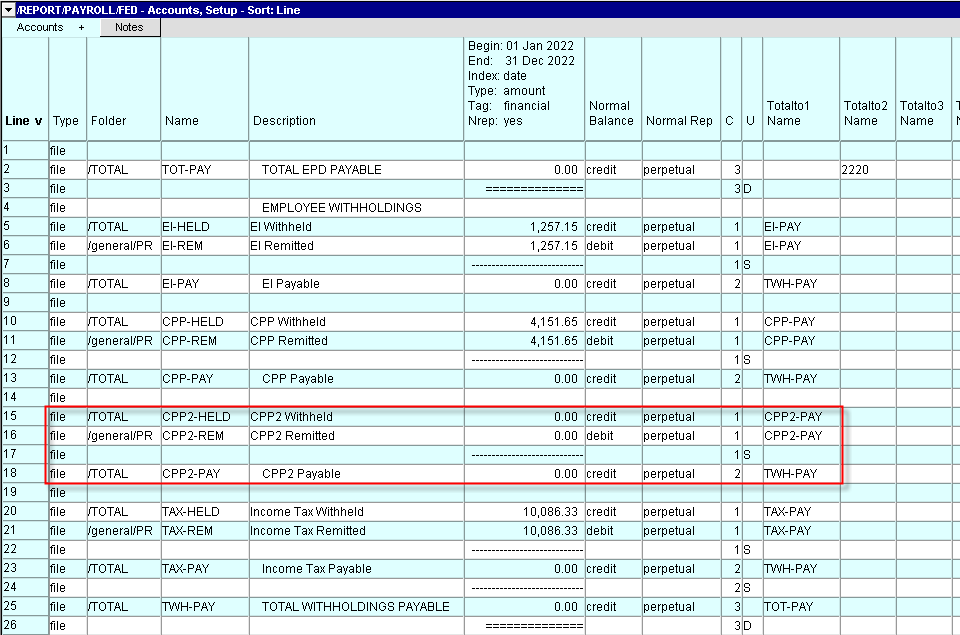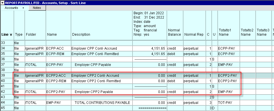 Add the new CPP2 accounts as shown in the rows outlined in red below. A total of six accounts need to be added.