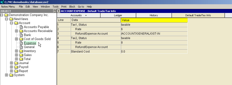 | Tax 1,2 | 1,4 | Status | taxable - the tax will be charged. exempt - the tax will not be charged. empty - the journal Status is used. The purchase journal has a corresponding setting for the status of each tax. But the setting on the expense account has higher priority than the journal so it provides the ability to override the journal setting on an expense-by-expense basis. |