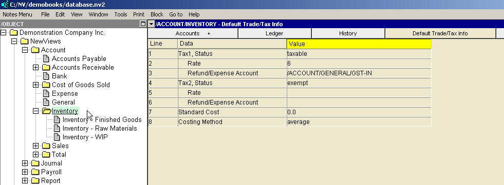 | 8 | average | If average is selected, NV2 calculates the cost (i.e. the value of the credit to inventory) based on a rolling average (i.e. the current value of inventory divided by the current quantity). NOTE: There are circumstances when it is not possible to determine an average cost. This occurs when the value of inventory or the quantity on hand is zero, and when this happens NV2 will revert to the standard cost, if set. It is good practice to specify a standard cost for all inventory items. It simplifies data entry at the time of purchase (by providing a default cost value on the invoice - which can be edited), and it guarantees that inventory credits and cost of goods sold debits have realistic values. |