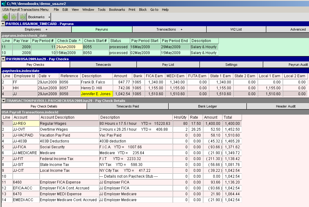 The Paychecks window is a split pane window. The top half (middle pane) displays a table of paycheck summaries for the employee that is currently selected. The bottom half (bottom pane) displays the transaction detail details for each paycheck.