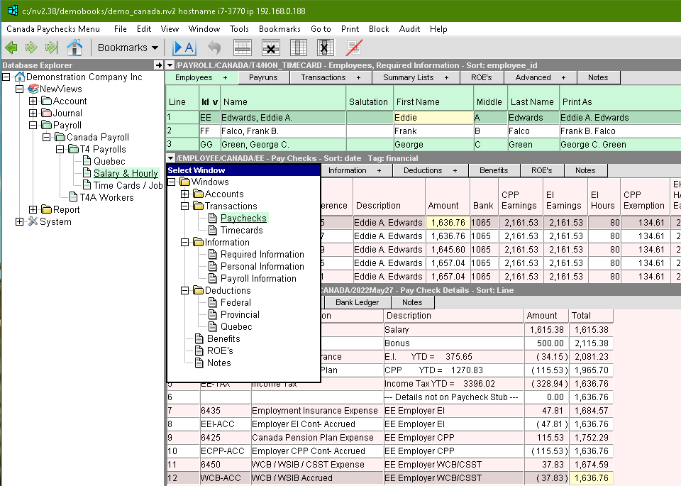 Note: You will often notice the same piece of information, such as the employee's Social Insurance Number, repeated on several windows or views. This does not mean you have to fill in the same information over and over. If you set the employee's S.I.N. in one window or view, it will appear in all the other windows and views.