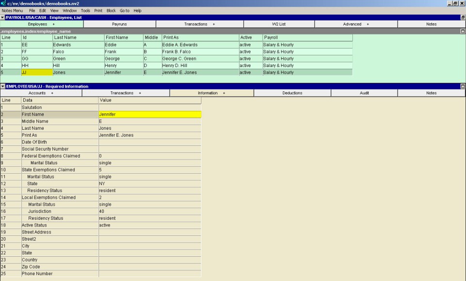 The Required Information window contains the minimum information required to calculate deductions and print paychecks, W2 forms, etc.
