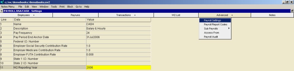 | 8 | Employer FUTA Contribution Rate | This specifies the contribution rate at which FUTA contribution is calculated. This is normally set to ".008". If you do not want payroll to calculate the FUTA contribution on each paycheck (you will do it manually) set this field to "0". |