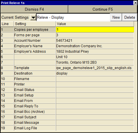 | 2 | Forms per page | This sets the number of Releve 1 forms on each Releve 1 page. (As of 2005 there are 2 forms per page.) Please see the How Many Copies & Forms To Set? for a full explanation of this. | |