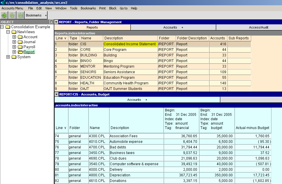 The image below shows the report table with the Consolidated Income Statement selected. This report has nineteen "subsidiary" report below it - each contribute amounts to the consolidated report.