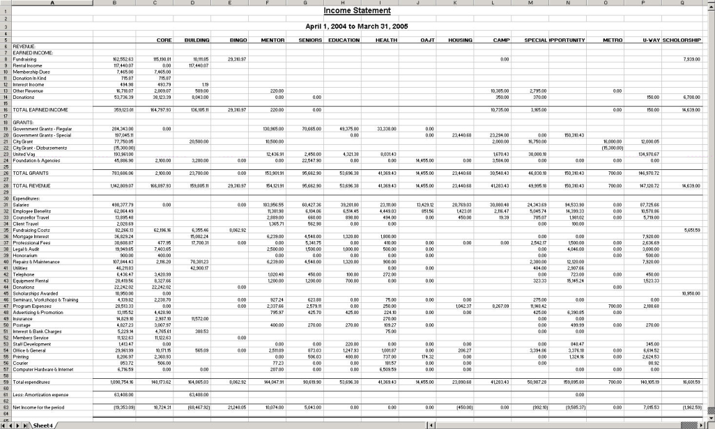 This is the resulting Consolidation Analysis displayed in Excel. (The report contains only fifteen report columns because the option to suppress zero-amount columns was used.)