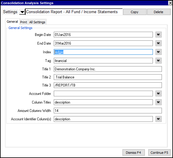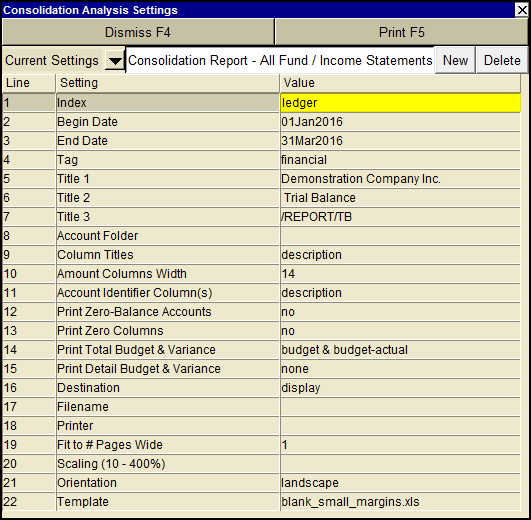 Issue the Print>Consolidation Analysis command, and enter/edit the settings as required.